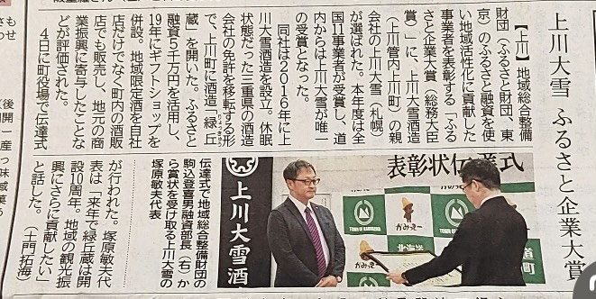[今日のニュース]上川大雪 ふるさと企業大賞